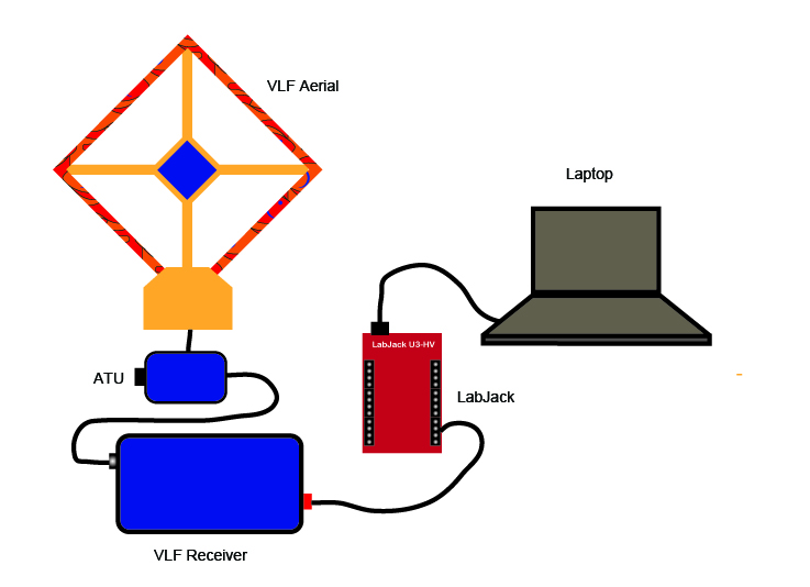 The receiver is a very low frequency radio receiver designed to operate at kiloherts frequencies: the UKRAA receiver is optimised to operate at 23.4Khz which is the frequency of transmission of a VLF source based at Ramsloh, Germany. The received signal is analogue so I connect my output to a laboratory data acquisition system called a LabJack.